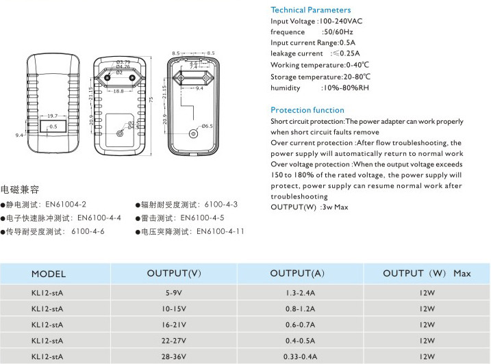 頻率:50/60Hz 輸入電流:0.5A 漏電電流:≤0.25A 工作溫度:0-40℃ 貯藏溫度:-20-80℃ 濕度:10%-80%RH 短路保護: 電源適配器在短路解除時能正常工作恢復(fù) 過流保護:過流故障排除后,電源將自動恢復(fù)正常工作 過壓保護:當(dāng)輸出電壓超過額定電壓的150-180%時,電源將保護,故障排除后電源能恢復(fù)正常工作" />