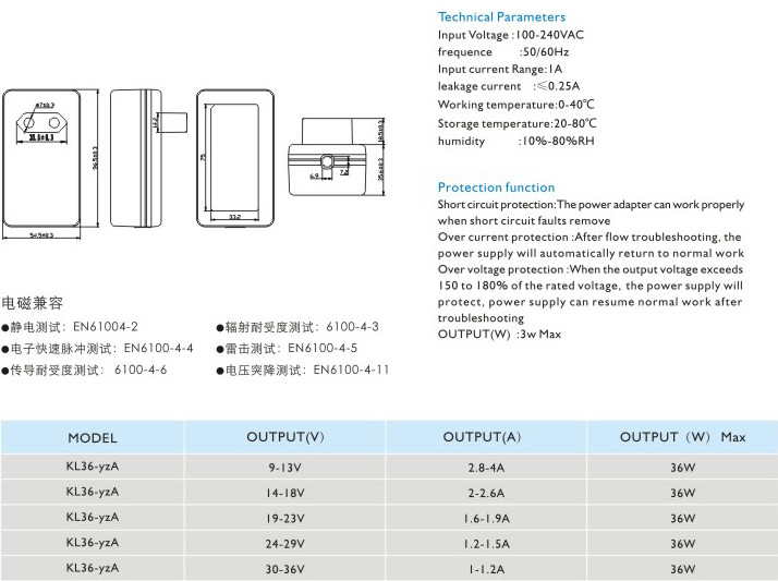 頻率:50/60Hz 輸入電流:1A 漏電電流:≤0.25A 工作溫度:0-40℃ 貯藏溫度:-20-80℃ 濕度:10%-80%RH 短路保護(hù): 電源適配器在短路解除時(shí)能正常工作恢復(fù) 過流保護(hù):過流故障排除后,電源將自動(dòng)恢復(fù)正常工作 過壓保護(hù):當(dāng)輸出電壓超過額定電壓的150-180%時(shí),電源將保護(hù),故障排除后電源能恢復(fù)正常工作" />