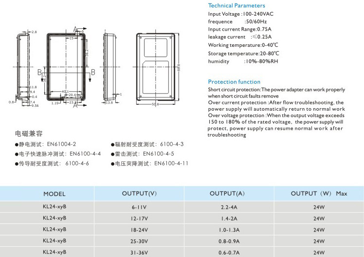 過流保護:過流故障排除后,電源將自動恢復正常工作 過壓保護:當輸出電壓超過額定電壓的150~180%時,電源將保護,故障排除后電源能恢復正常工作 輸入電壓:100-240VAC 頻率:50/60Hz 輸入電流:0.75A 漏電電流:<0.25A 工作溫度:0-40℃ 貯藏溫度:-20-80℃ 濕度:10%-80%RH" />
